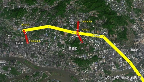 西起天河区的黄村立交,与广州环城高速互通,往东在火村立交处与广澳高速(广州绕城高速)互联互通,在增城区新塘街道穿越东江后进入东莞区域。