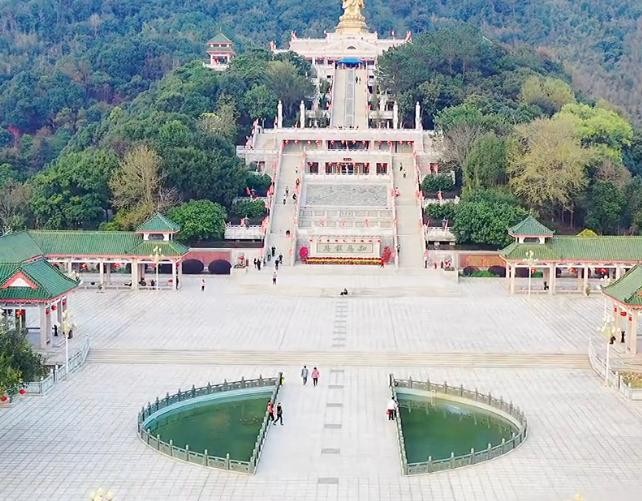 寺院依山而筑,前低后高,沿蛇形中轴线依次建有天王殿、大雄宝殿、祖殿、塔殿,两侧回廊连接,还有钟鼓楼、斋堂、僧房、莲花池等建筑,总建筑面积3.3万平方米。