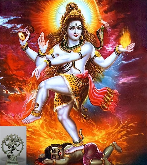 我们还经常看到湿婆在火中舞蹈这一形象,祂的一只手执鼓,这是代表着生命的生生不息,左手托着火焰,表示毁灭,右脚之下踩着个侏儒,代表着无知和愚昧。另外的两只手和一只脚在空中摆动着,构成一幅精美的火中舞蹈画面。舞蹈既象征着湿婆的荣耀也象征着宇宙的永恒运动,运动是为了使宇宙不朽。在一个旧时代结束时,祂会通过跳坦达瓦灭世之舞,来完成世界的毁灭,并使之回归到宇宙精神中。