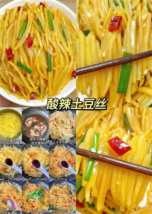 准备食材:新鲜土豆、青红椒、葱姜蒜、盐、醋、糖、鸡精、花椒粉、辣椒油等。将土豆去皮、洗净,切成细丝,用清水浸泡片刻,去除多余淀粉。青红椒去籽切丝,葱姜蒜切末备用。起锅烧油,油热后放入葱姜蒜爆香。加入土豆丝翻炒至断生,加入青红椒丝继续翻炒。调入盐、糖、鸡精、花椒粉,翻炒均匀。沿锅边淋入适量醋,翻炒均匀,使土豆丝充分吸收醋香。最后淋入辣椒油,翻炒均匀即可出锅。