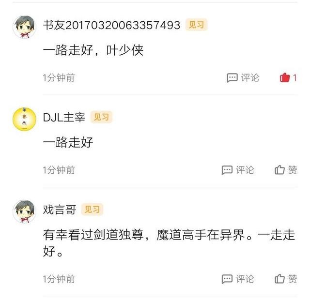 小编去翻看剑游太虚以前作品的同时,发现有很多网友自发的在他的作品评论区留言悼念:“刚看到讣告,很震惊,很久以前就看过您的书了,喜欢里面的剑意描述,唉,先生一路走好。”“愿天堂没有病魔,一路走好”“上高中的时候看过《剑道独尊》这本书,对我启发很大,今天听到讣告,一路走好,愿天堂没有病痛!”