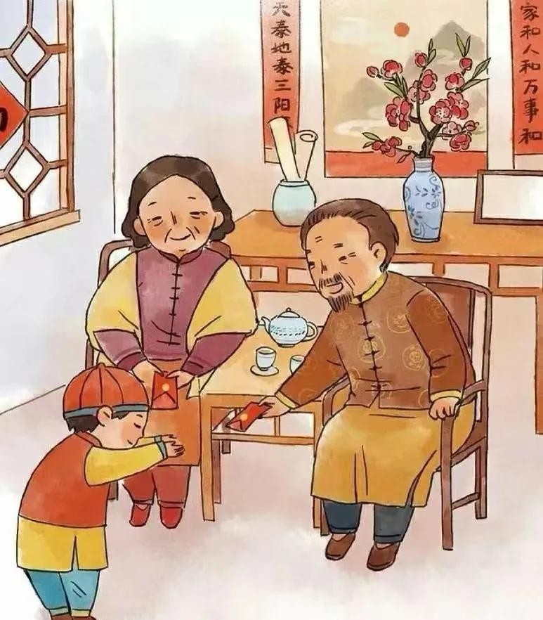 村里李姓大户人家,夫妻老年得子,但体弱多病,年三十那天晚上,老夫妻用红纸把八枚铜钱包好了放在小儿枕边。临到半夜,一阵阴风嗖嗖吹过,祟小妖刚要用他的白手摸孩子的头,突然孩子枕边迸出一道金光,祟妖吓得桃之夭夭。从此,它再也没敢来过,李家的小儿子身体也慢慢强壮了起来,很快,这件事就像插上了翅膀,立刻就传开了。村民们纷纷效仿,在大年除夕夜里用红纸包上铜钱,放在孩子的枕头下面,人们把这种钱叫“压祟钱”,因为“祟”与“岁”同音,父母都希望自己的孩子岁岁平安,长命百岁,久而久之,就改称“压岁钱”了。