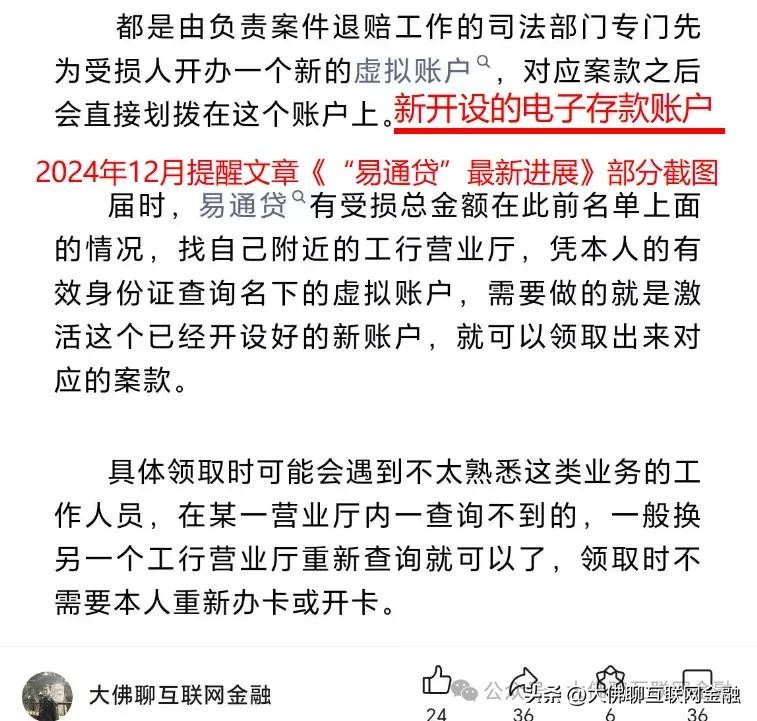“易通贷”案此前跟进的消息,第一次的案款发放时间预计是2025年1月中下旬春节前,目前实际发放开始的时间比预计的,还是早了一些。