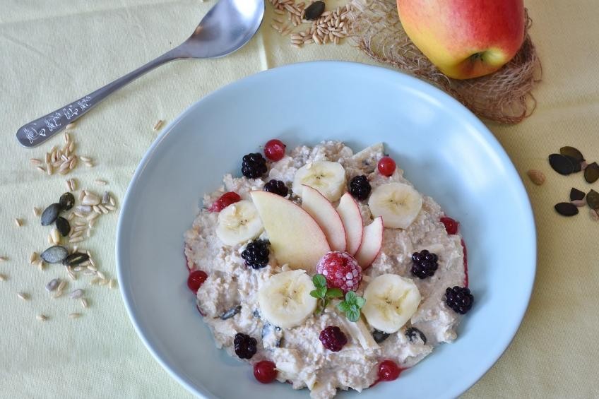 食材:燕麦片50克,牛奶250毫升,香蕉半根,苹果半个,葡萄干、蜂蜜适量