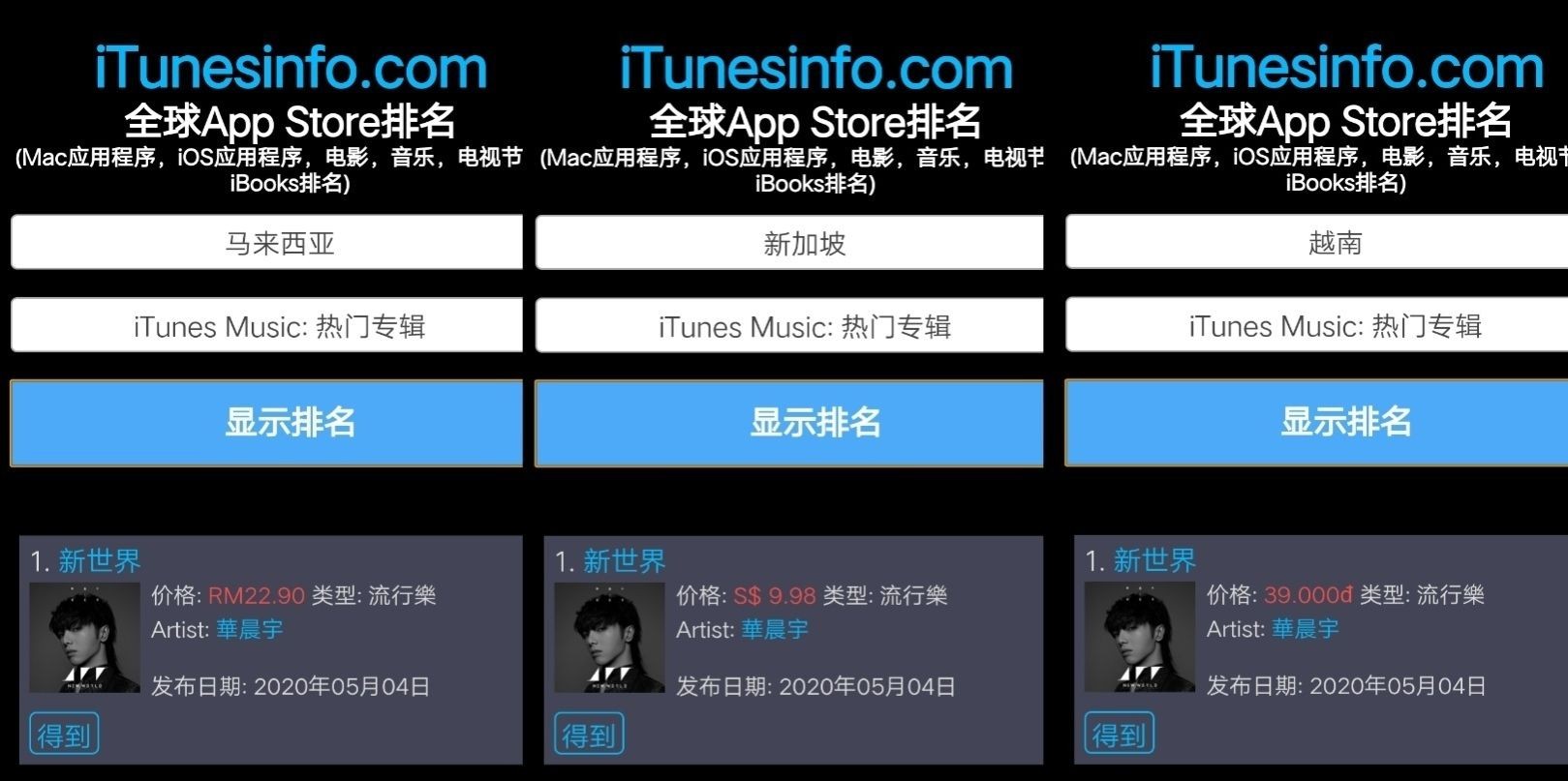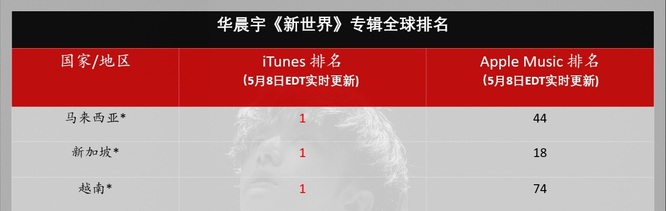 华晨宇的第四张专辑《新世界New World》一上线iTunes就连续五天霸榜了马来西亚、新加坡及越南的榜一!