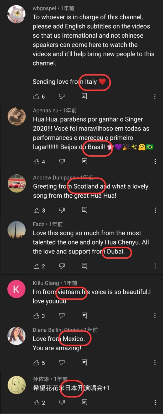 截图可以看到华晨宇的歌迷来自世界各地。
