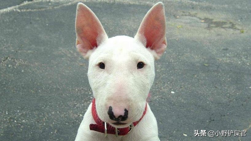 它们的脸型从正脸看就像一个蛋,脸部的轮廓是饱满的卵形。从侧面看,它的头顶和鼻尖间的距离形成了稍微向下的弧线,额头平坦。它的眼间距更是无敌了,两只"豆子"眼之间的距离大概是狗界第一吧,这也许是它的脸部太过扁平的原因。牛头梗的一双耳朵小而薄,并且两耳紧挨,可以完全直立。