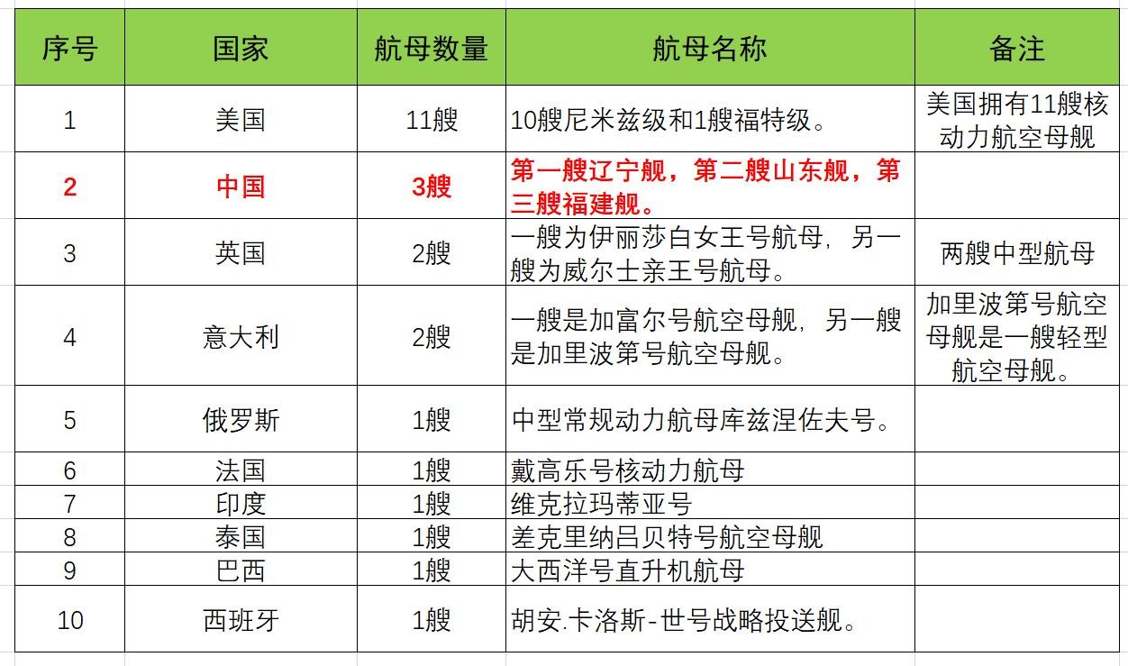 世界各国航空母舰的数量不一,在世界各国航母一览表2023中,大家是可以看到多数国家现役航空母舰的数量,日本虽然之前有航母,但现役没有,日本的1艘改造中的轻型航母,加贺号预计到2024年才能服役。那么我国的航空母舰有多少,我国目前有三艘航母,分别为辽宁舰、山东舰和福建舰,而拥有航空母舰数量最多的国家还是漂亮国,绝对优势地位,比其他国家加起来都多。