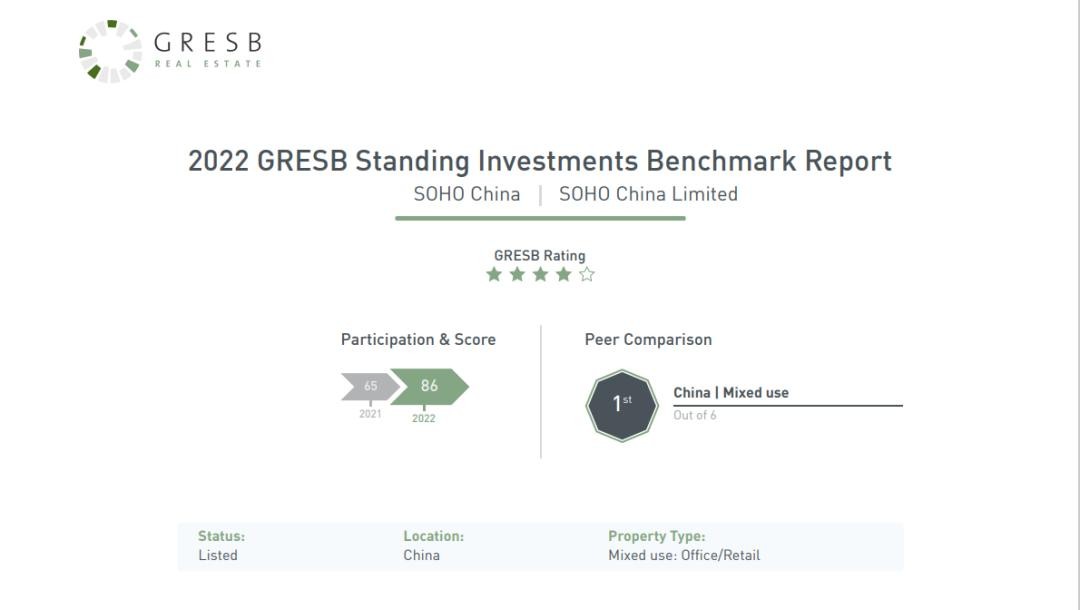 10月4日,国际评级机构GRESB(Global Real Estate Sustainability Benchmark全球房地产可持续发展评估指标)公布了2022年度评级结果,SOHO中国以86分(总分100分)获评四星级评级,在6家中国地区同类型企业中位居第一,在全亚洲12家同类型企业中名列前茅。