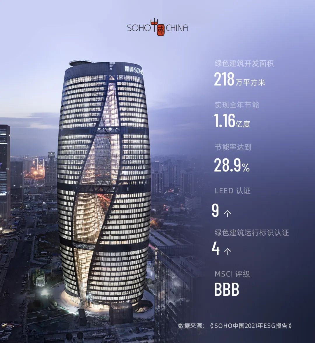 SOHO中国较早关注到环境、社会、管治(ESG)话题,通过参与资本市场ESG评价,不断调整优化在相关工作方面的表现。2022年,SOHO中国连续第六年发布ESG报告,披露其过去一年中在这些方面采取的行动及取得的成就。据报告,SOHO中国完成全年节电1.16亿度,相当于减碳9.6万吨,节能率达到28.9%。同时开启了打造中国首个零碳图书馆项目,计划投入2000万元,实现了环境保护与社会价值的和谐统一。