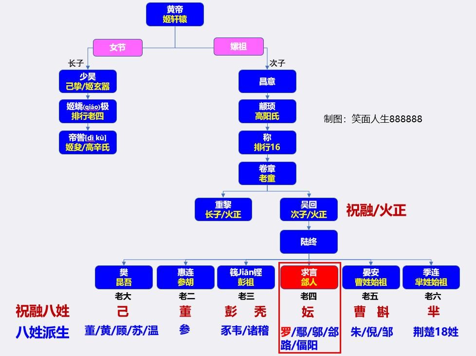 老四求言,姓妘yún,其后代夏朝时期先后建立罗国(河南罗山县)、郐国(河南新郑西北)、邬国(河南许昌鄢陵县)、鄢yān国(河南许昌鄢陵县)、偪fú阳国(山东枣庄市台儿庄西南)、路邑(今北京通州),派生出罗、郐、邬、鄢、偪阳、路等姓。