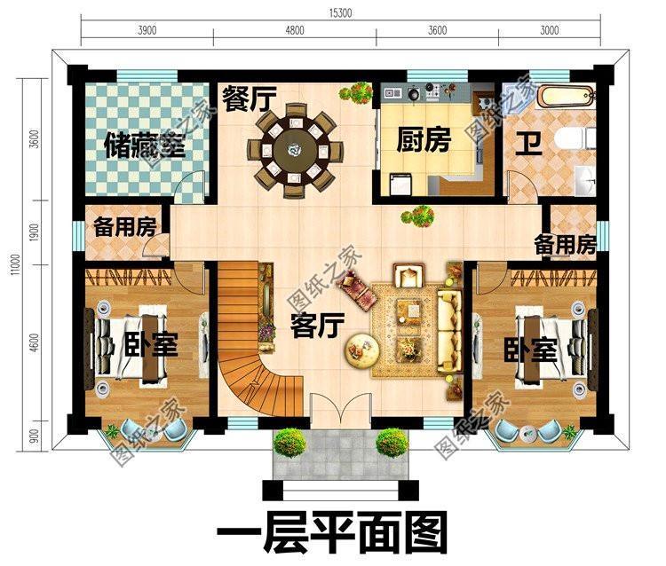 一层户型:客厅、厨房、餐厅、卧室x2、卫生间、备用房x2,、储藏室;