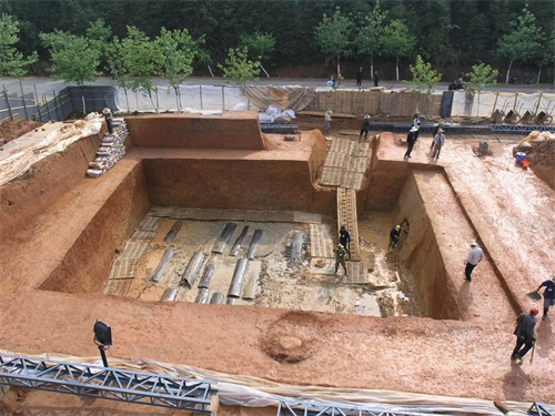 考古人员发现墓穴有被盗掘的迹象,于是加快工作进程.由于厚重封土覆盖,只能先清理封土堆。在清理过程中发现西周时期陶片,确定了大墓的年代。随着发掘推进,这座大型土坑竖穴基墓逐渐露出全貌。确定为东周时期的李洲坳墓葬.(李洲坳事故地名)墓室面积远超同时期诸侯王面积。