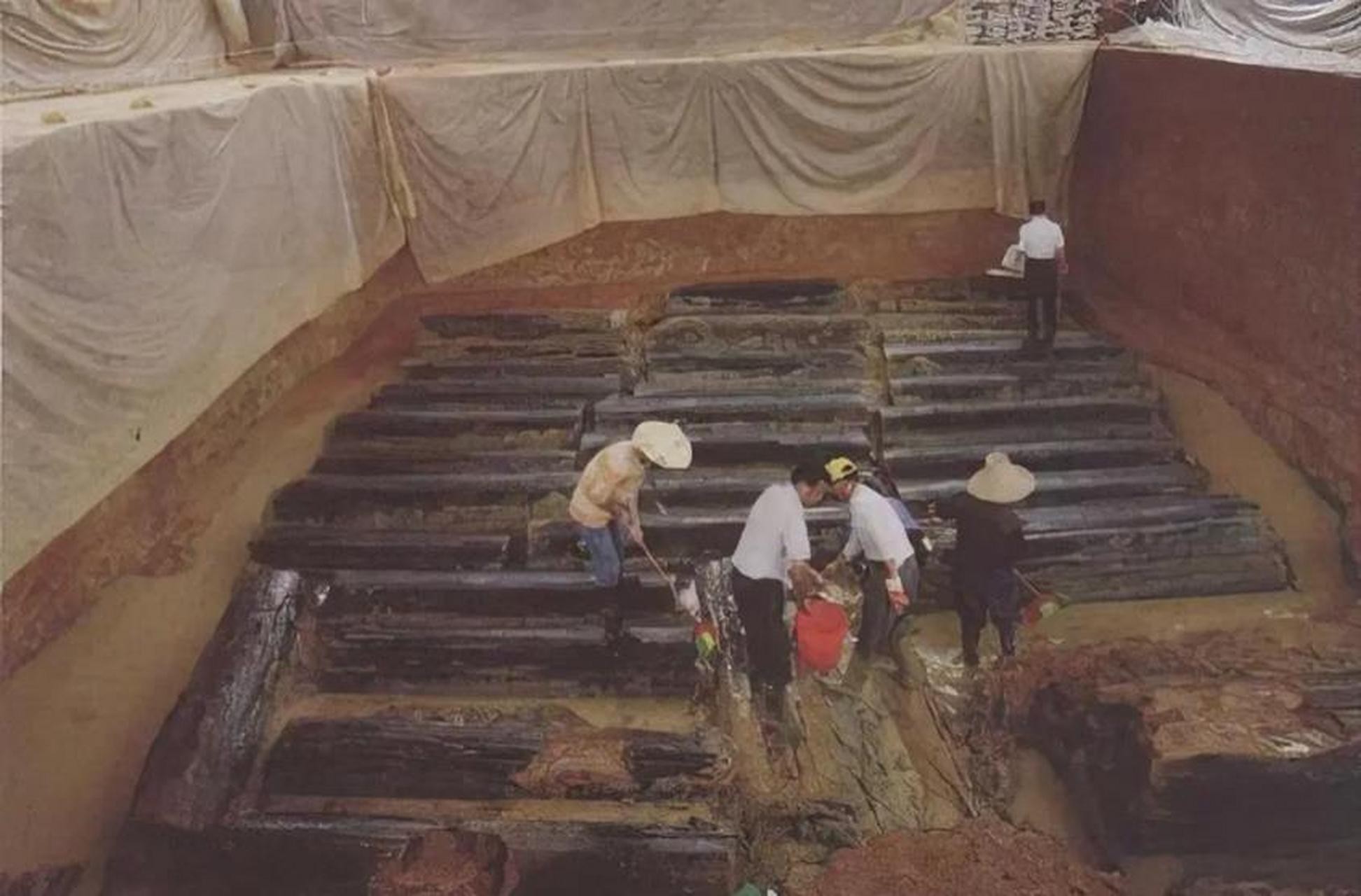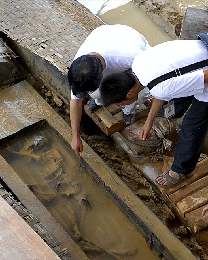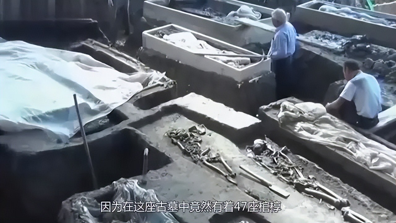 清理工作深入时,发现含有铁、锰等金属元素的沙土层,清理完泥土后,打开墓室168 平方米的墓坑底部密密麻麻摆放着 47 具棺木,大小各异、长短有别多数保存完整。其中有一具男性骸骨,其余46具为女性骸骨.