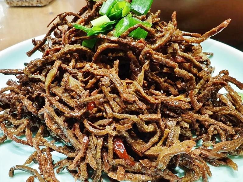 崩肝是另一道正定特色菜,色泽酱红,油而不腻,干香耐嚼,越吃越香,非常下酒。崩肝的制作很特殊,以羊肝、牛肝或猪肝为主料,先处理干净,放入高汤中煮熟,再切成均匀的细丝,这一步很考验刀工,再下锅炸制金黄,最后再回锅爆炒,搭配调料和高汤,再次卤制入味,大火收汁即可成菜。