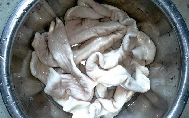 第三步:将浸泡过的猪大肠取出,用清水冲洗干净。这里有一个小技巧,你可以在清洗的过程中加入少量醋,醋具有去味和杀菌的作用,会进一步提高清洗效果。