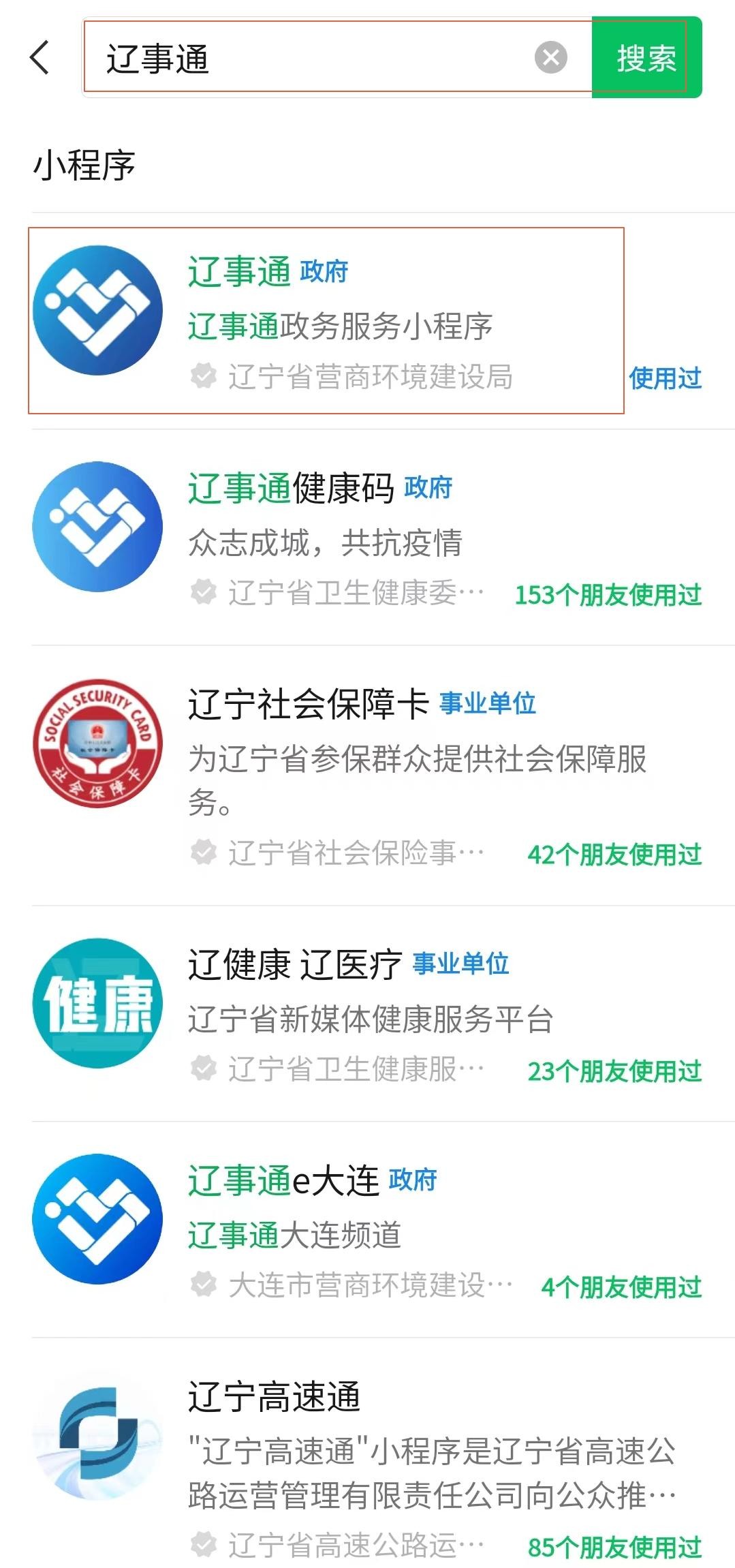 1.在微信里面,搜索辽事通小程序,点击并打开。