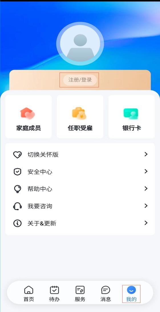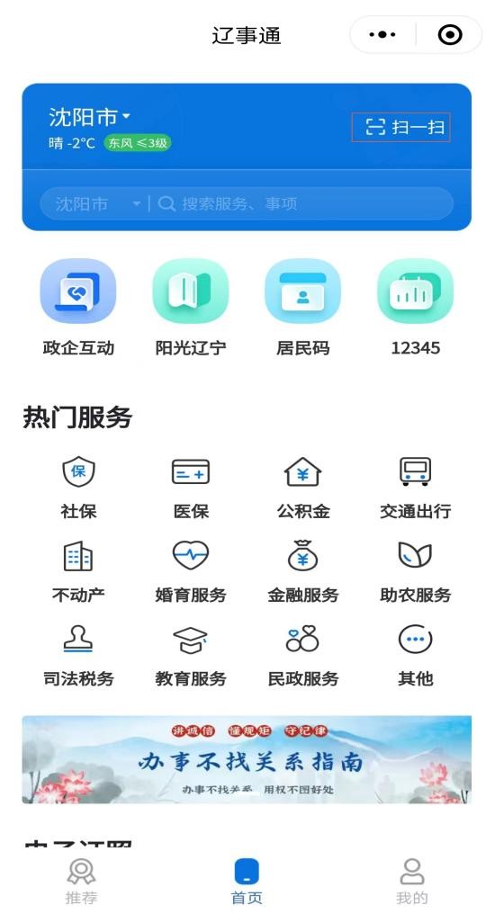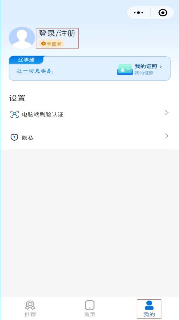 2.打开辽事通小程序主界面,首先点击右下角“我的”功能,点击界面上边【登录/注册】按钮,完成登录后,再返回首页,点击右上角【扫一扫】按钮,扫描屏幕中的二维码即可完成登录。