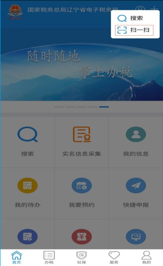 打开辽宁移动办税APP,首先登录企业/自然人业务,显示“已登录”状态后,再返回APP首页,点击右上角“+”,点击【扫一扫】按钮,扫描屏幕中的二维码即可完成登录。