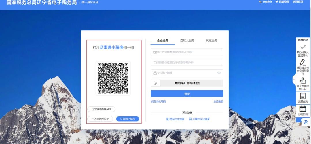 注意事项:采用辽事通小程序登录方式登录,扫码后,网页版电子税务局登录的为自然人业务。如需办理企业业务,可通过账户中心下【身份切换-企业办税】功能切换至企业业务。