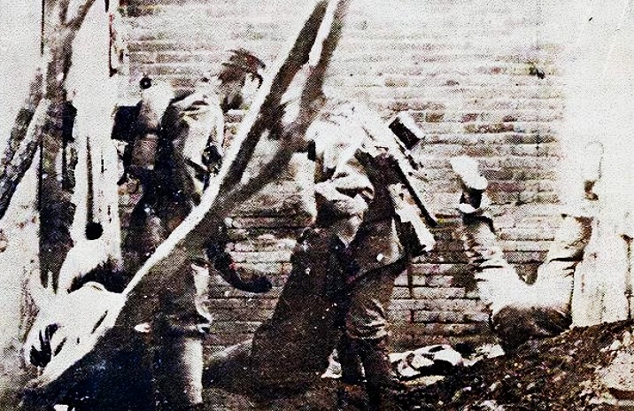 吊打酷刑就是用绳子捆住大拇指,也有从背后捆住双手吊在木梁上的,日本宪兵站在木梁下用棍子和皮鞭抽打被吊着的人。棍棒和鞭子打得人皮开肉绽,鲜血顺着绳子流下,体弱的人被打昏甚至打死。