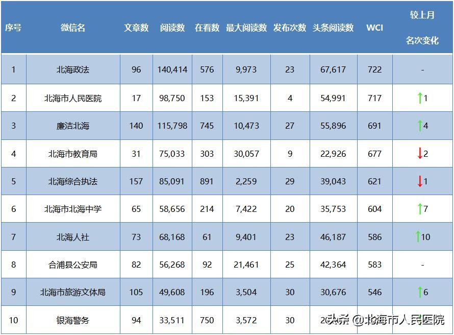 2021年4月份,北海市政务微信活跃账号109个矩阵账号共发文1569次,推文总数为5486篇。榜单前三的账号分别为北海政法、北海市人民医院、廉洁北海,北海政法继续占据榜首。