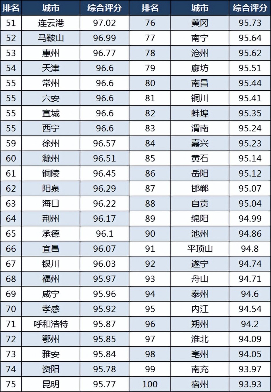 昆明排名第75位,宿州排名第100位;焦作排名第101位,大同排名第102位;