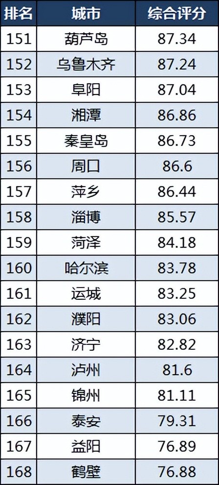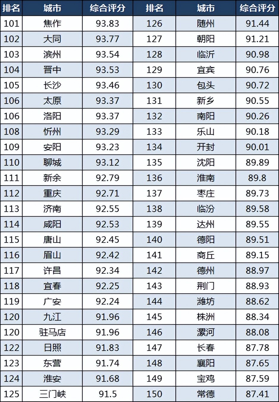 东营排名第123位,长春排名第147位;宝鸡排名第149位,常德排名第150位;
