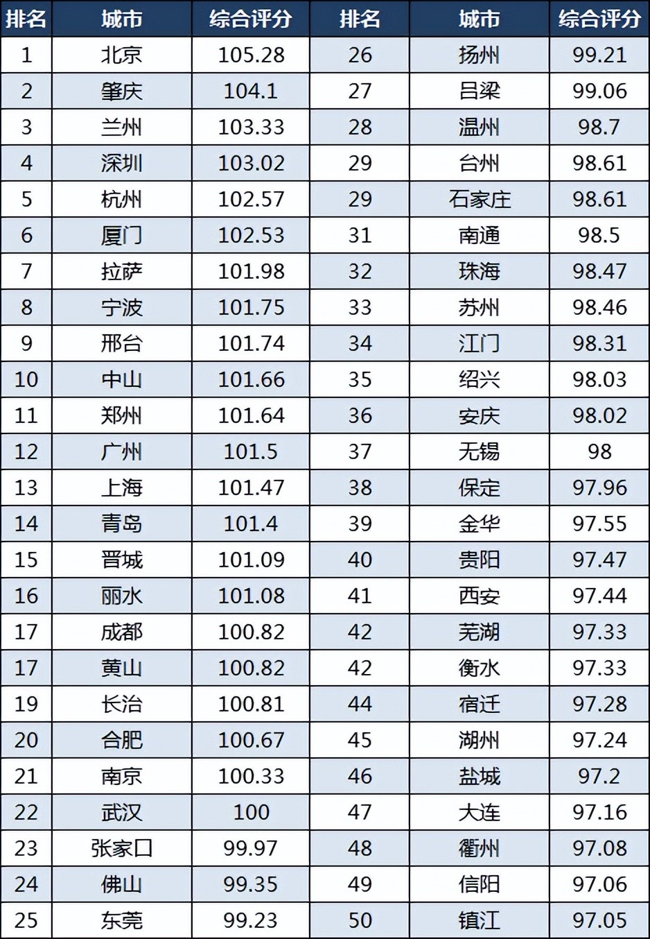 城市空气质量100强:兰州第三深圳第四,武汉第22,昆明第75