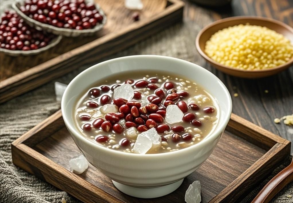 红豆和小米提前泡发,加水煮至红豆软烂。加冰糖调味,即可食用。