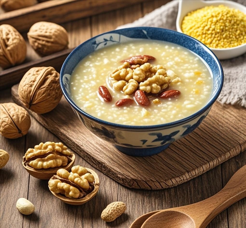 小米、核桃、花生洗净,浸泡10分钟。放入锅中加水煮沸,小火慢熬40分钟,直至核桃、花生软烂。