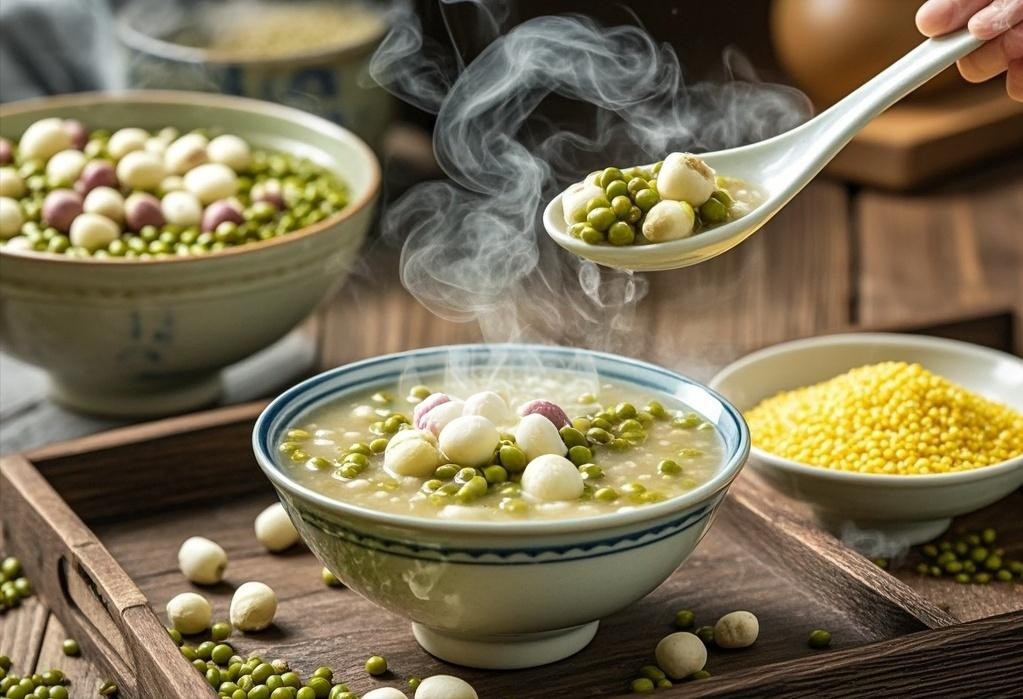 绿豆和莲子提前浸泡,小米洗净。将材料放入锅中加水煮沸,小火煮1小时。