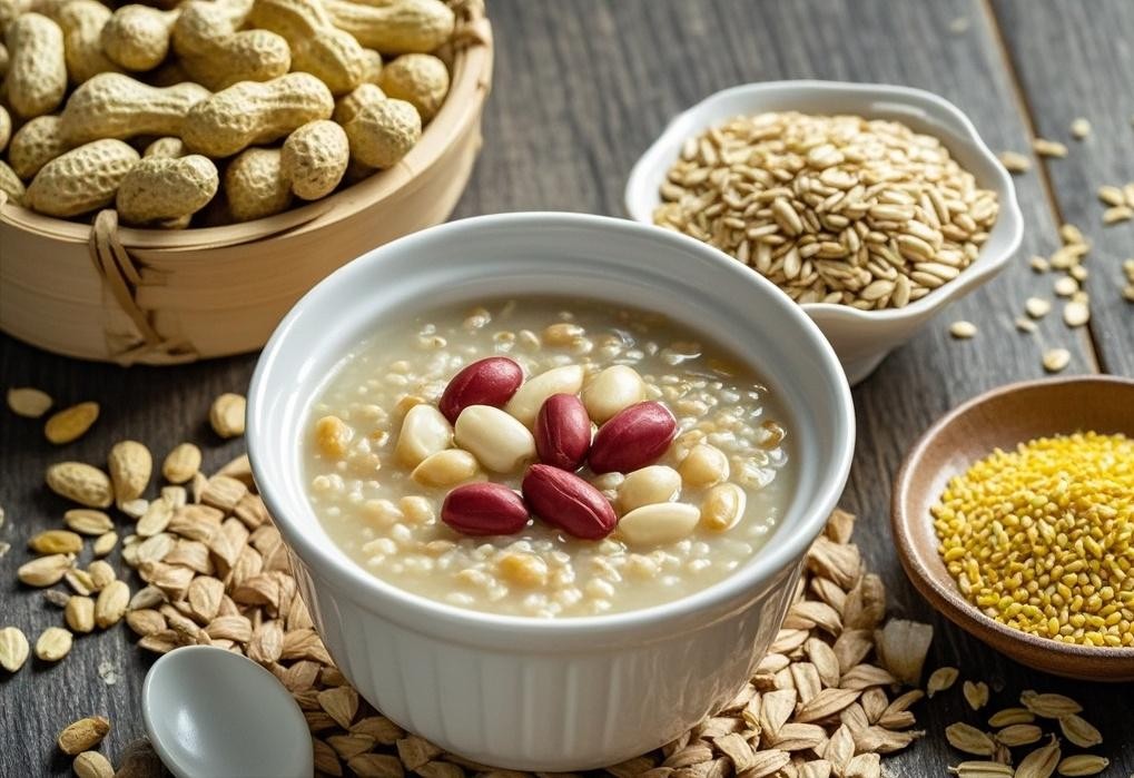 花生、燕麦、小米分别洗净,浸泡10分钟。加水煮沸,小火煮至软烂,约40分钟。