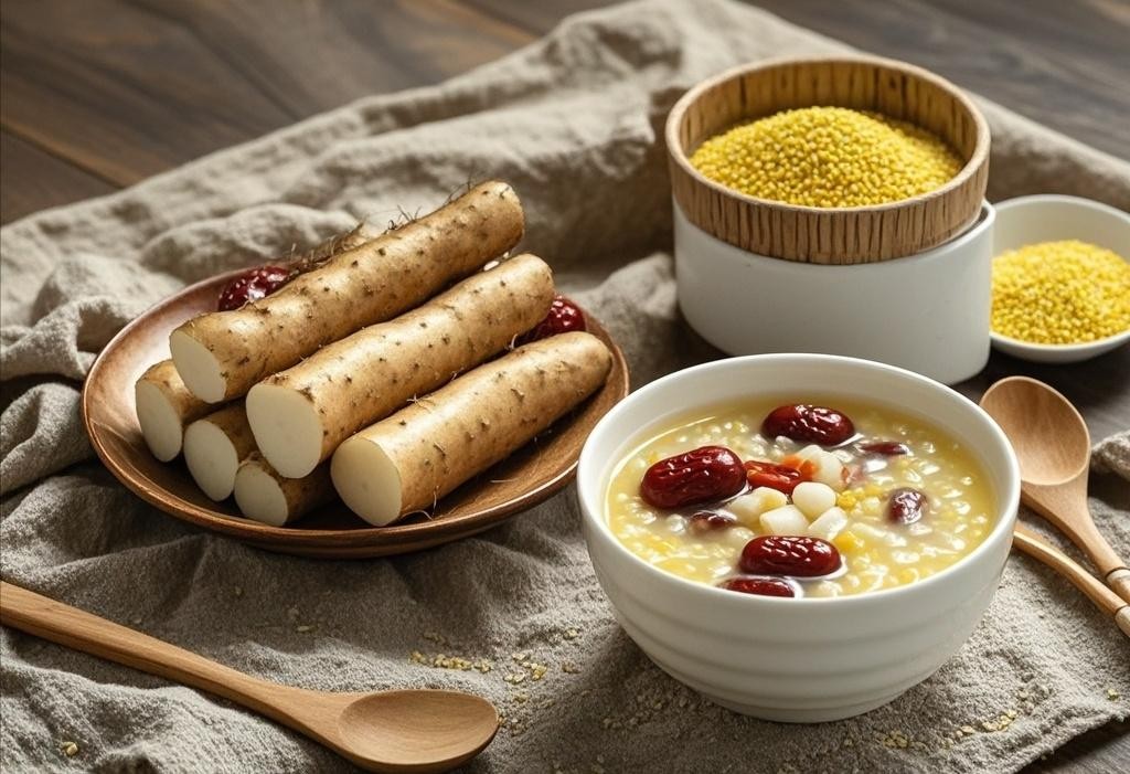山药去皮切小块,用清水浸泡。红枣去核,小米和红枣一起煮约20分钟。加入山药继续煮20分钟至软烂。