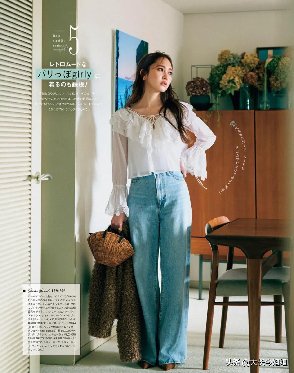 白色、荷叶边、蕾丝等流行元素的罩衫与宽腿牛仔相结合,是今春最甜美的法式风情。