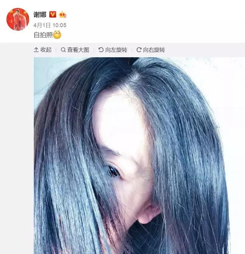 这张自拍照算是粉丝福利了。自从生孩子之后,谢娜基本上没有公开露面过,只有在4月1日发了一张用头发遮住脸的自拍照。