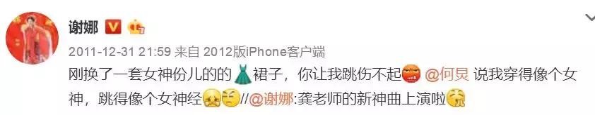 2011年12月31日,谢娜发了8条微博。提到的人有何炅、龚琳娜、胡彦斌等人。