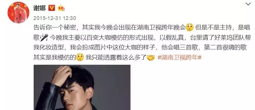 2016年12月31日,谢娜发了5条微博,提到了陈乔恩。