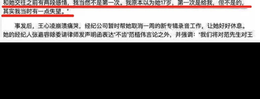 范值伟曾公开发文说:“和王心凌交往之前她有2段感情,当然不是第一次。原本以为王心凌17岁第一次是给他,但不是的。”而对于这一点,王心凌的初恋男友欧定兴也发文说王心凌的第一次不是给的他。这让王心凌的形象受损事业也受到严重影响。