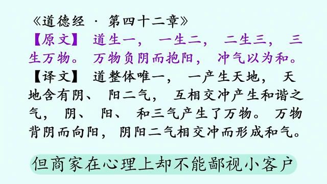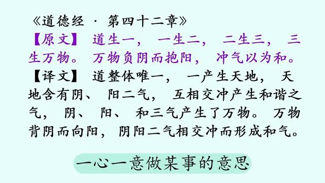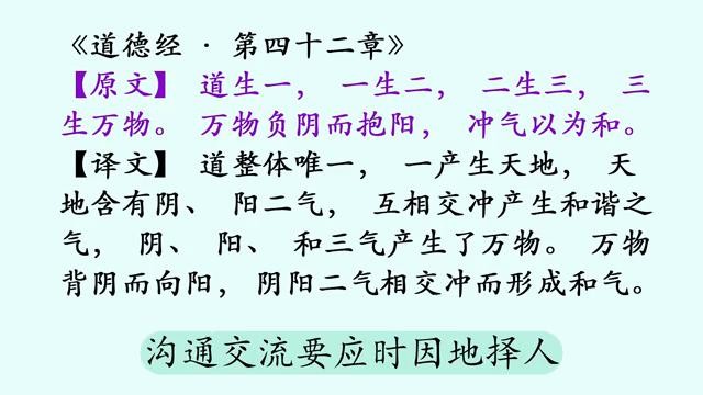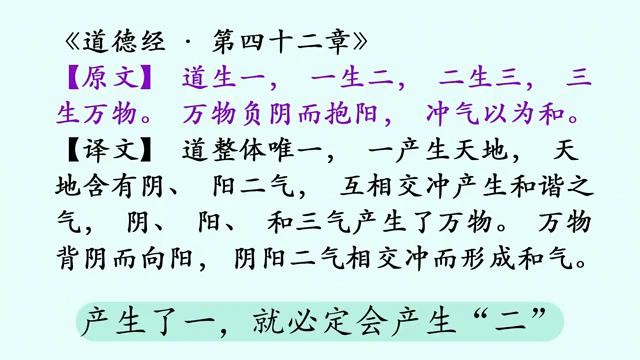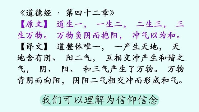 先说正文:"道生一,一生二,二生三,三生万物。万物负阴而抱阳,冲气以为和。"这句话阐述的是宇宙生成演变过程,宇宙以及万物皆为"道"所生,所以宇宙以及万物也皆有"道"性。