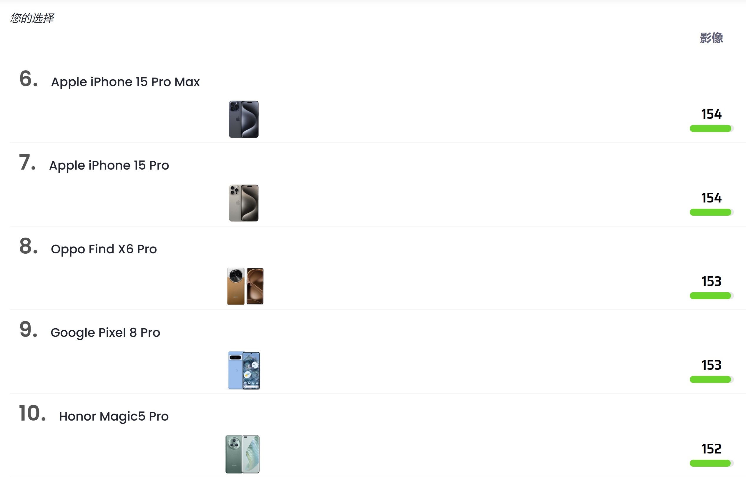 排名第6-10位的分别是:iPhone 15 Pro Max、iPhone 15 Pro、OPPO Find X6 Pro、Google Pixel 8 Pro、荣耀 Magic5 Pro。这个区间同样也是没有拉开差距,6-10名也就是一、两分的区别。