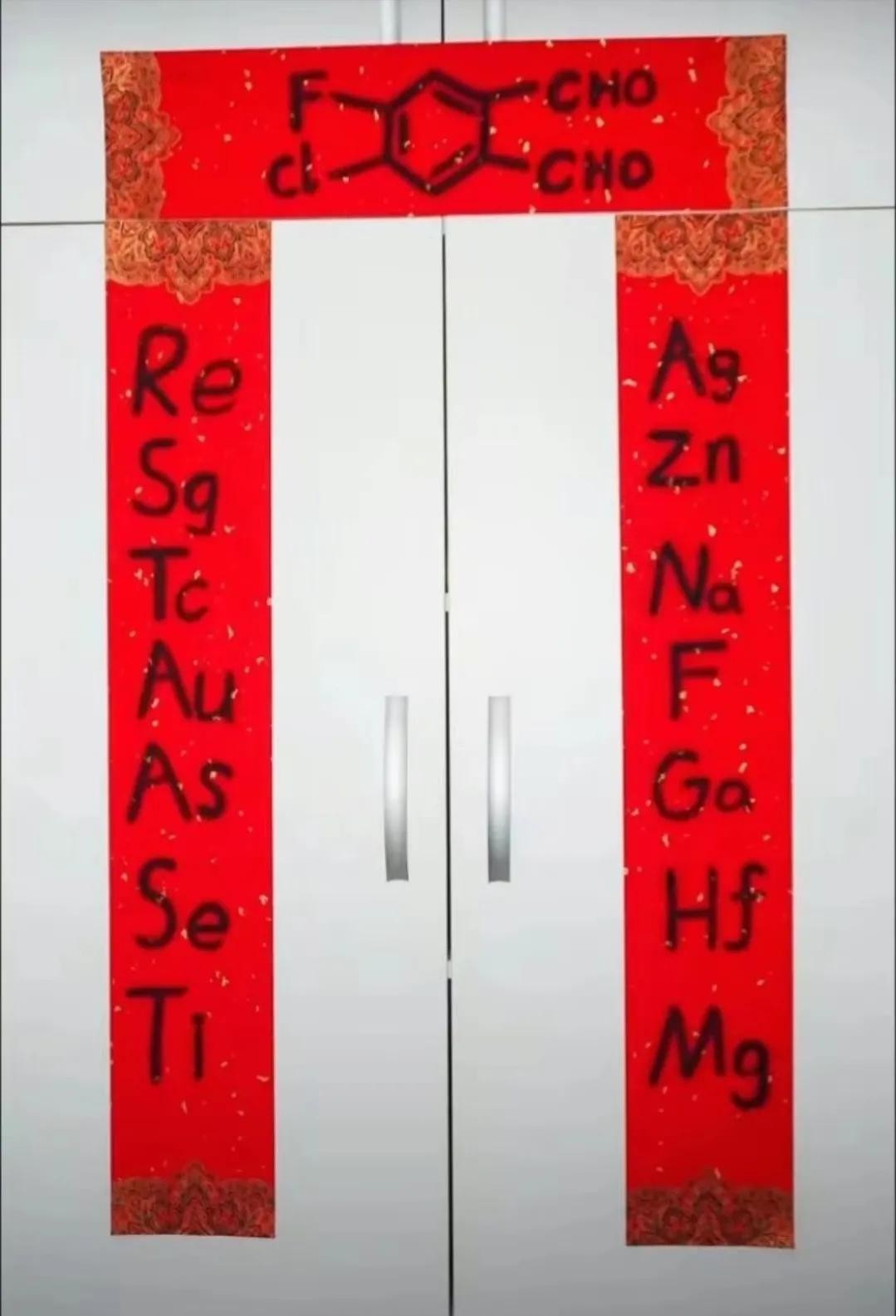 这个春联没有化学底子可真看不懂,最后还是网友给的解释,上联是:Ag Zn Na F Ga Hf Mg,即银锌钠氟镓铪镁(迎新纳福家和美);下联是:Re Sg Tc Au As Sc Ti,即铼锝金砷钪钛(来喜得金身康泰);横批是:F Cl Cho Cho,即氟氯双醛(福禄双全)。