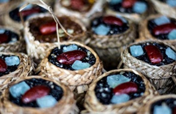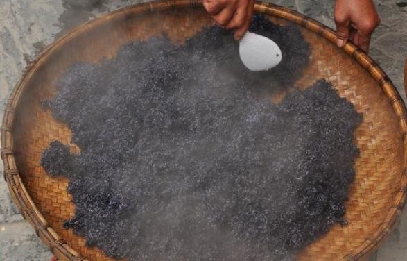 2、在不同的季节,乌稔树叶与糯米的比例是不一样的。在清明至立秋,树叶色素最多的时间段,使用的乌稔叶最少;立秋到冬至的时候,乌稔叶的量需要增加;冬至到来年清明,使用的比例又需要根据每天树叶的颜色和经验目测,随着节气逐渐增加。
