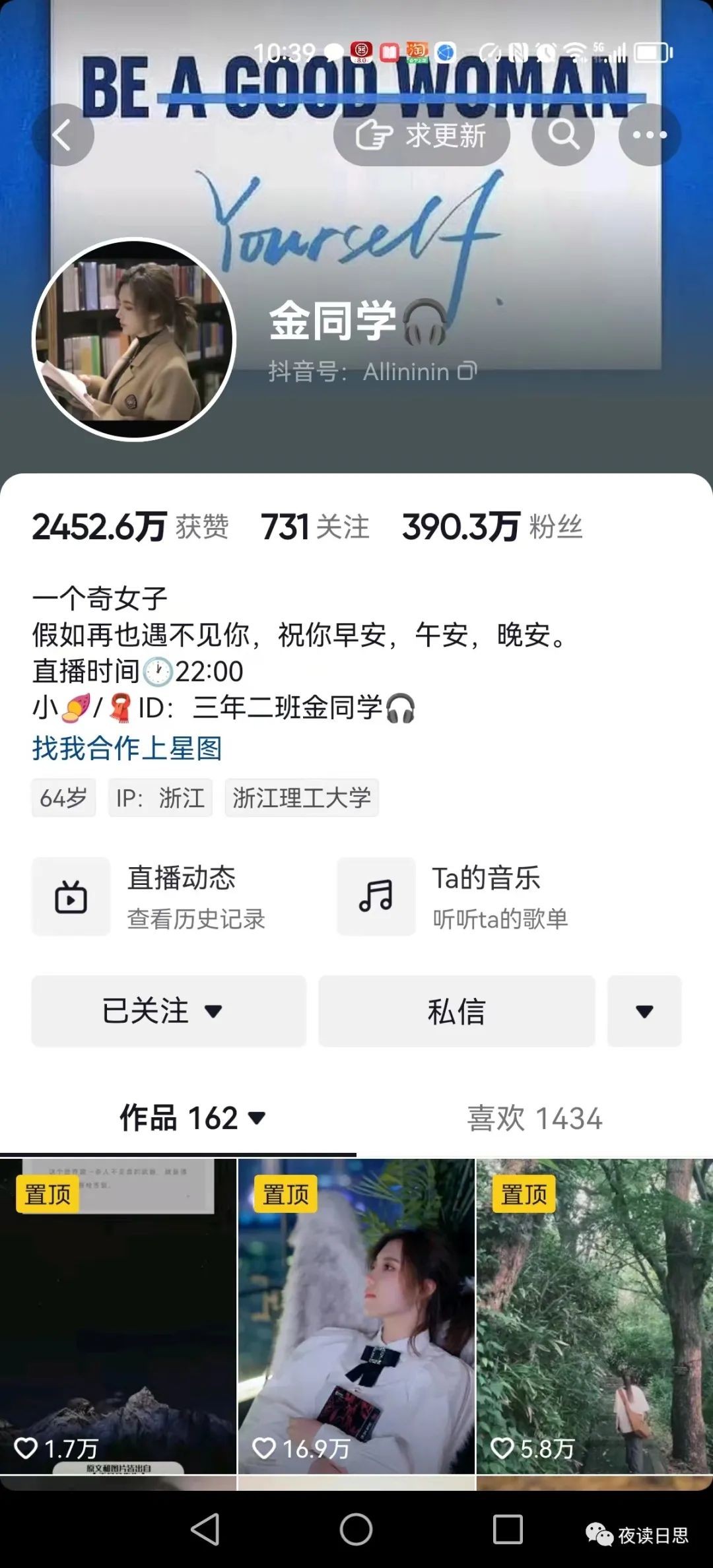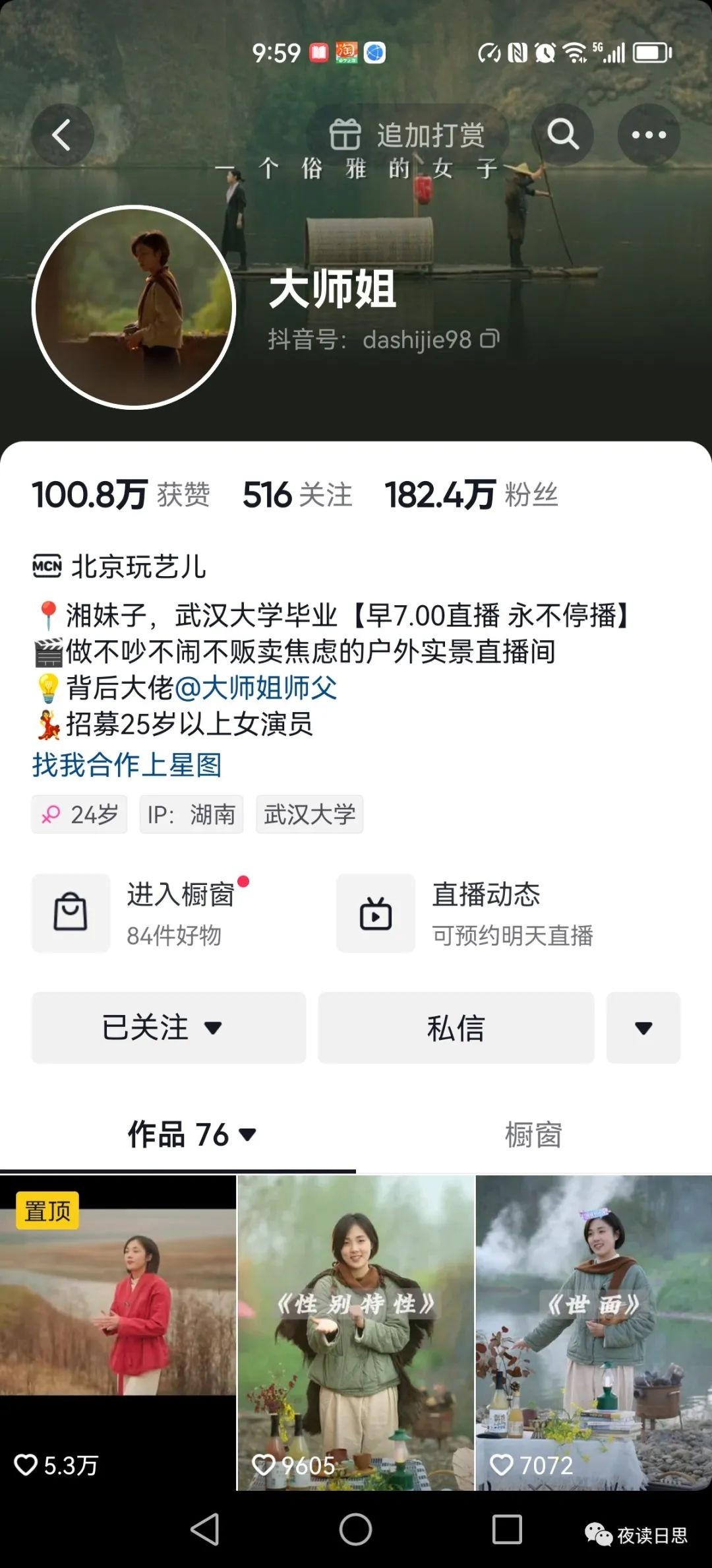 这是一个现象级的账号,从她刚开播时候,就关注了,认定她必然爆火,她是一个治愈焦虑的独特符号。户外实景直播,没有商业变现,走到哪里,直播到哪里,从容、优雅、文静、知性,穿着朴素,仿若邻家女孩,淡妆素雅,书卷气、烟火气兼具,篝火、茶香、蓑衣、油纸伞,明媚的笑容、娓娓道来的清新,每天清晨和傍晚直播,你只要安静的听着就感觉很美好。