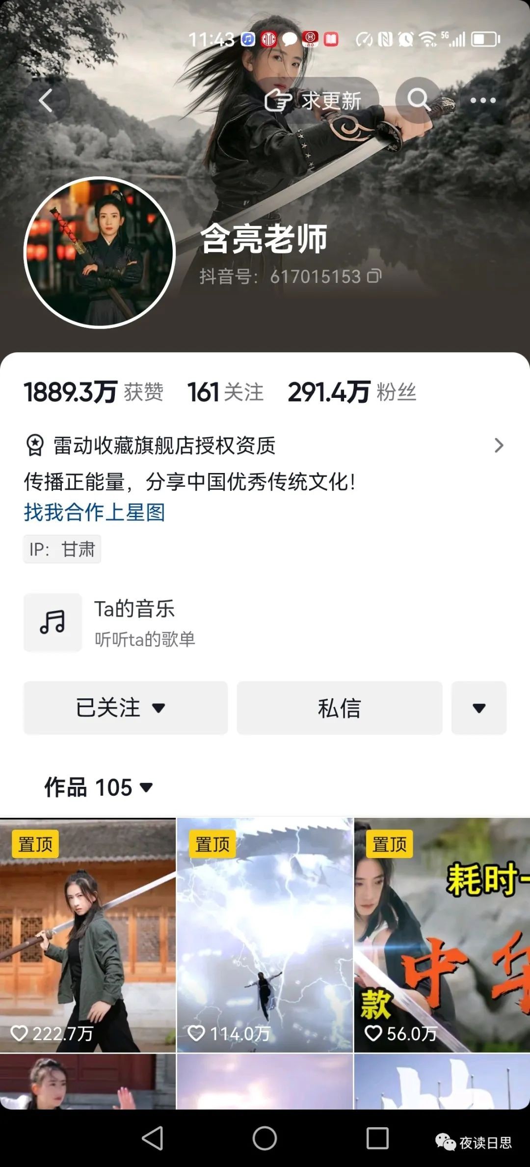 如果你喜欢中国武术,喜欢各种兵器,有一种侠义精神,那么,这个账号一定是你的绝佳之选。视频拍摄精良,运用电影手法,运镜衔接自然,女主角飒爽英姿、潇洒飘逸,当真是:偶得三尺剑,跨海斩长鲸。收鞘挂壁上,犹有铮铮鸣。