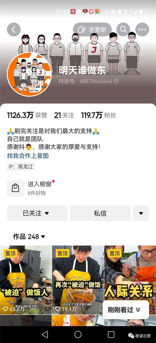 这个接近120万粉丝的账号,是乔公子的心头爱。有趣的剧情是,他们都是工作在一起的小伙伴,每天谁在办公室掌勺做饭,都会用一个限制条件来决定,比如,谁的微信步数最少,谁的微信好友最多,谁带了圆形饰物,谁是下班最积极的人,谁的体重最大,选出天选做饭人。而且,每天的饭菜不一样,每天的特色都让人期待。每个职工都是演员,每个员工都有自己的特色,如果你是美食爱好者,必关注。