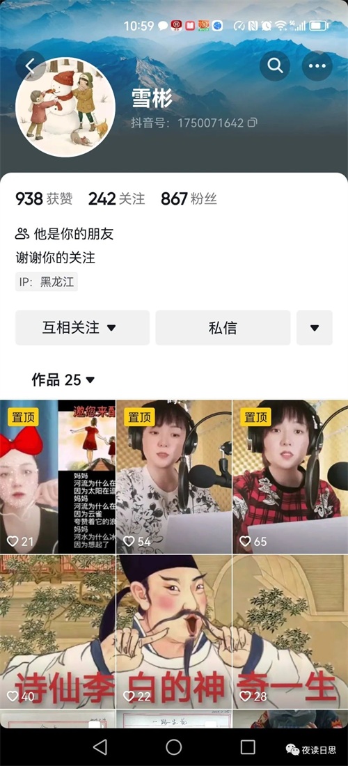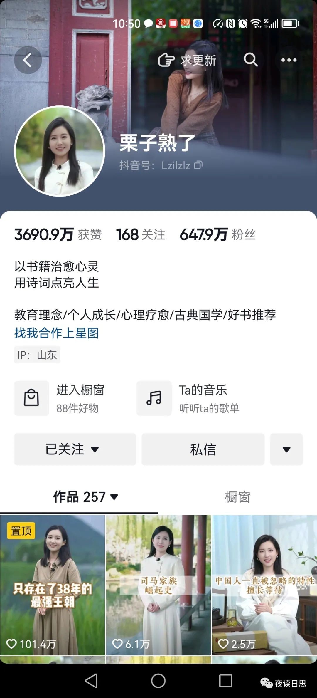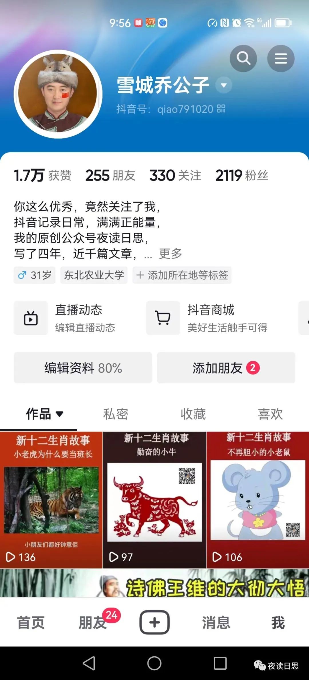 这是夜读日思公众号创始人的抖音号,专注于传统文化的现代化、创新化、独特化解读,推出唐朝诗人系列、新十二生肖故事粤语版系列,将来还会推出百家姓系列和毛泽东诗词系列,期待我们在文化传统与创新的碰撞中找到心灵的慰藉和灵魂的抚慰。