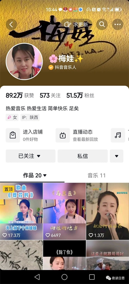 这是个独特而有辨识度的抖音号,擅长陕北民歌和经典老歌,气息、节奏、感情都把控得很完美,眼中有光、音中有爱、歌中有情。让你不自觉的欣赏她的才华,往往充沛的感情让你跟随她心神荡漾。她的声音非常空灵,绕梁三日不为过。如果你喜欢经典老歌,喜欢安安静静听一听陕西民歌,那么她会让你欲罢不能。