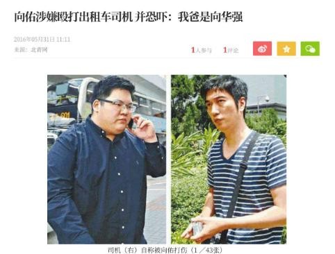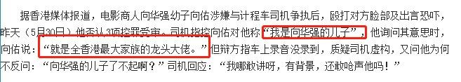 2016年,向佑在旺角搭乘出租车时,与司机发生冲突,他不仅怒甩司机几个耳光,还在司机出手反击时,高调自报家门,或许是考虑到老爸向华强的名号还不够响,于是他便又加上了几个更加唬人的标签,自称是香港最大黑b大佬的儿子。
