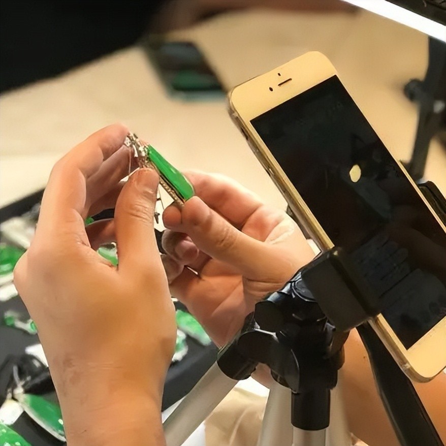 而能让人们相信直播间里的翡翠玉石是真的的秘诀就是,打光以及垫一张白纸,利用光影所形成的一定的角度,整个翡翠的色泽都可以提升一个档次。